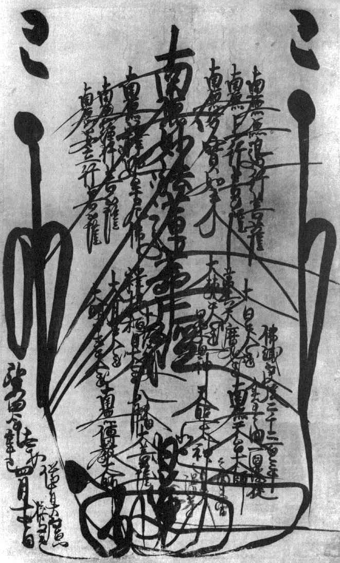4e année de Kōan (1281), 4e mois, 17e jour. La date est écrite en bas à gauche contre le bord, sous le Roi de Lumières Amour. |